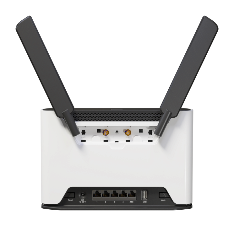 Chateau LTE18 axkészlet négymagos IPQ-6010 1,8 GHz-es CPU-val, 1 GB RAM, 1 x 2,5 Gigabit LAN, 4 x Gigabit LAN, két vezeték nélküli interfész (beépített 2,4 GHz-es 802.11ax kétláncú vezeték nélküli, beépített 5Ghz 802.11ax kétláncú vezeték nélküli) külső antennákkal, LTE CAT18 modem nemzetközi sávokhoz 1/3/5/7/8/20/28/38/40/41 integrált antennákkal, SMA csatlakozók külső antennákhoz, toronyház, USB , 1,5 m-es RJ45 kábel, tápegység, RouterOS L4