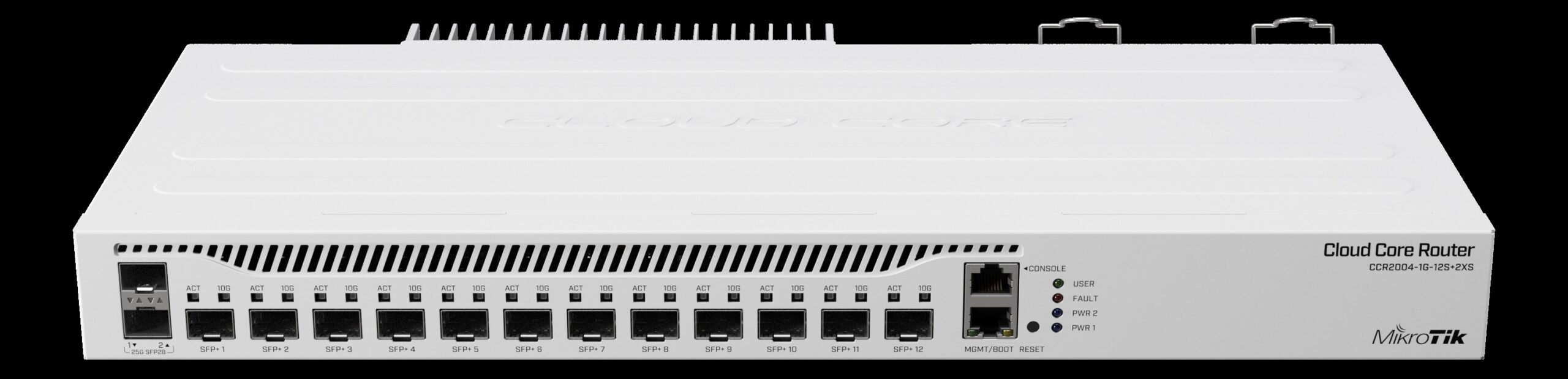 Cloud Core Router 2004-1G-12S+2XS Annapurna Alpine AL32400 Cortex A57 CPU-val (4 mag, 1,7 GHz magonként), 4 GB RAM-mal, 1 db Gigabit RJ45 porttal, 12 db 10G SFP+ kerettel, 2 db 25G SFP28 kerettel, RouterOS L6-tal, 1U rackbe szerelhető házzal, dupla tápegységgel
