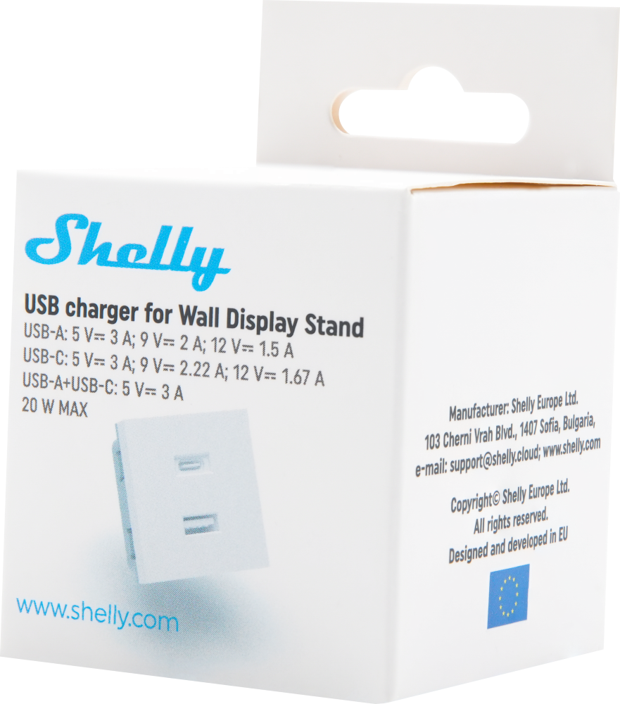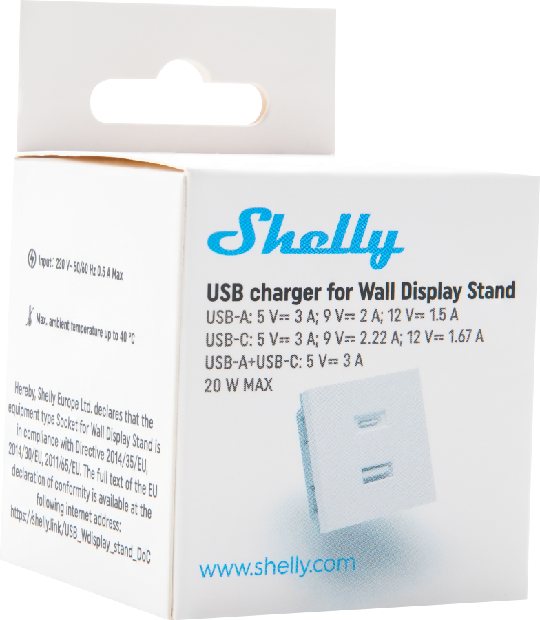 USB töltőadapter (USB-C/USB-A) – Kifejezetten a Shelly fali kijelzőállványhoz tervezve. Bővítse a Shelly fali kijelzőállvány tápellátási lehetőségeit a cserélhető kupak Shelly USB töltőadapterre cserélésével.