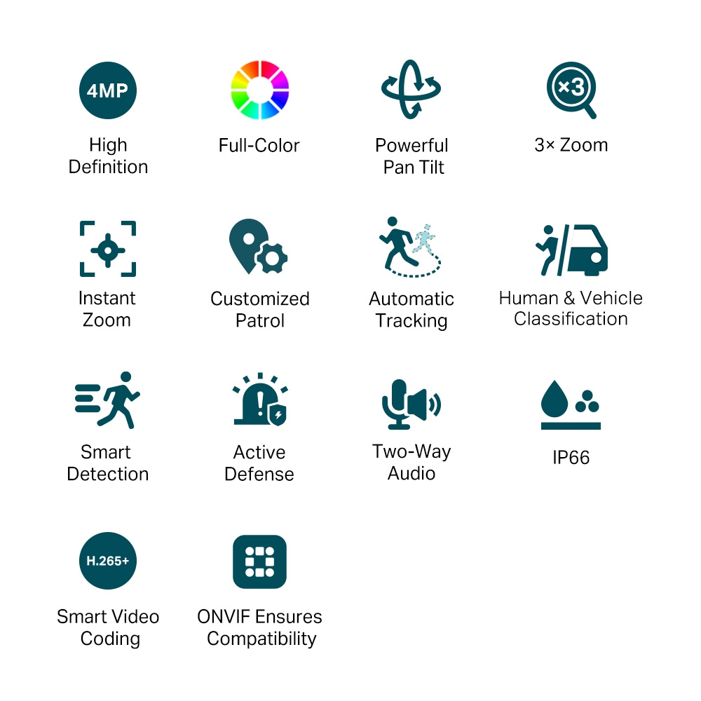 - Aktív védelem: Hanggal és fénnyel azonnal figyelmezteti a potenciális behatolókat rendellenes események esetén.