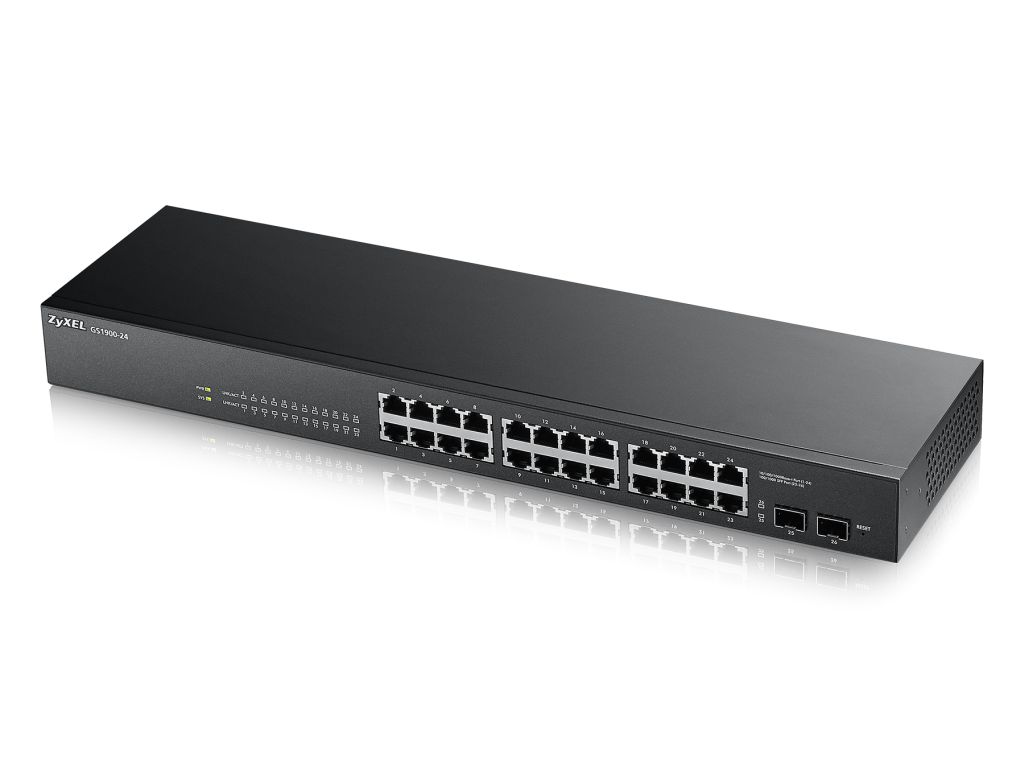 Webes felügyeletű gigabites switch (24x 10/100/1000, 2x SFP) indítási, VLAN, vendég VLAN és QoS beállításokkal. Plusz 2 SFP bővítőhely 19″-os telepítéshez. A GS1900-24 webes felügyeletű GbE switch gigabites sebességet biztosít és átfogó felügyeleti funkciókkal rendelkezik. Ez a 24 portos, rackbe szerelhető modell ideális rugalmas, nagy teljesítményű hálózat kiépítéséhez kisvállalkozások számára.