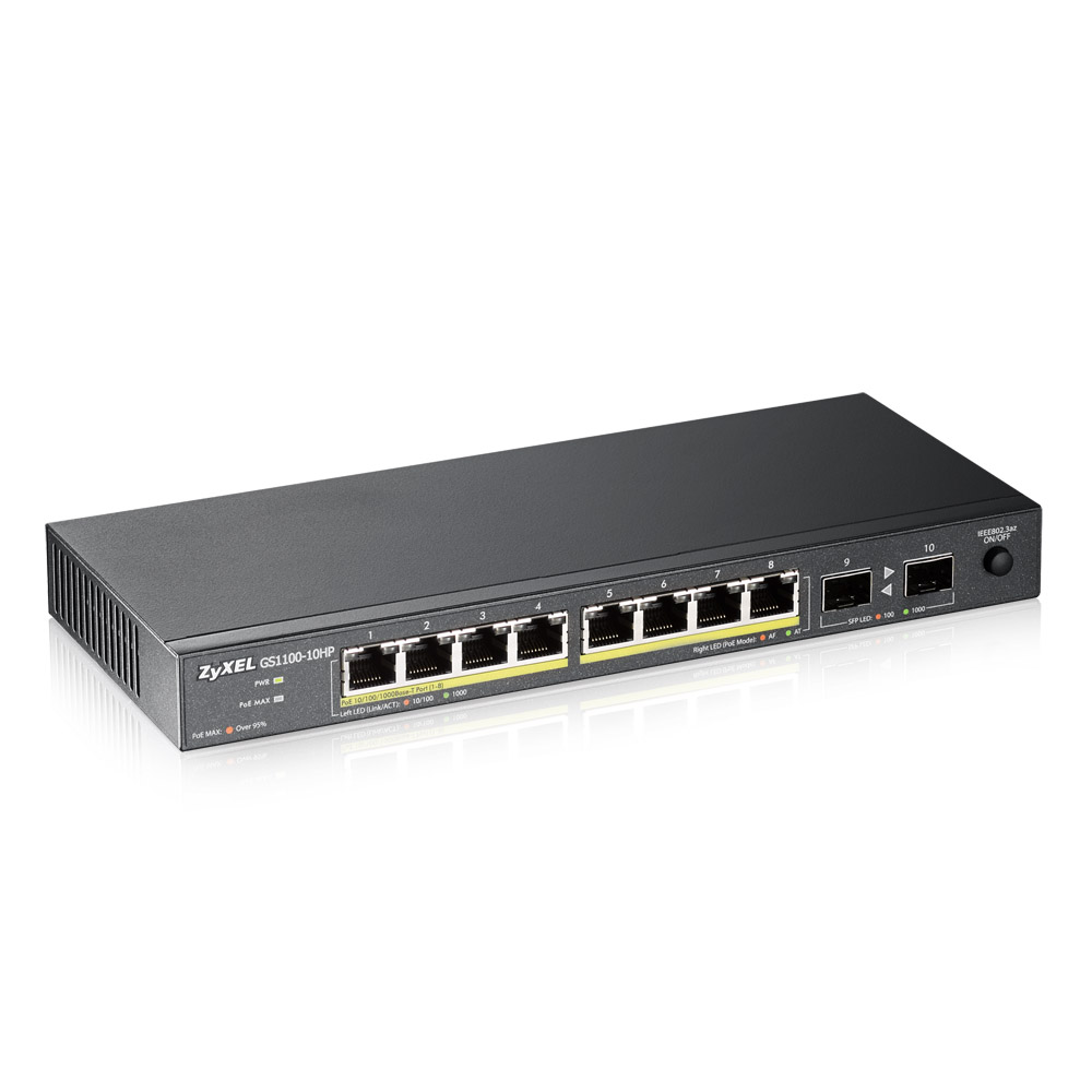10 portos, nem menedzselt Gigabit PoE switch, 8x Gigabit, 2x optikai felcsatlakozás, 802.at PoE teljesítménnyel 120W, V2 Költséghatékony megoldás gigabites kapcsolatokhoz asztali számítógépeken A ZyXEL GS1100 sorozat a legjobb megoldás az azonnal elérhető gigabites kapcsolathoz irodai környezetekben, ahol a csendes működés és a jobb energiahatékonyság fontos. Az energiatakarékos funkciókkal, a gigabites Ethernettel és a ventilátor nélküli kialakítással a GS1100 sorozat felhasználóbarát plug-and-play funkciót kínál a sávszélesség-igényes hálózati alkalmazásokhoz. Zöld hálózatépítés A GS1100 sorozat nemcsak gigabites Ethernet kapcsolatot kínál a következő generációs hálózati alkalmazásokhoz, hanem energiatakarékos funkciókat is a jobb energiahatékonyság érdekében. Mivel az átviteli teljesítmény dinamikusan állítható a forgalom, az aktív kapcsolatok és a kábelhossz alapján, a GS1100 sorozat csökkentheti az energiafogyasztást, ami alacsonyabb üzemeltetési költségeket eredményez.